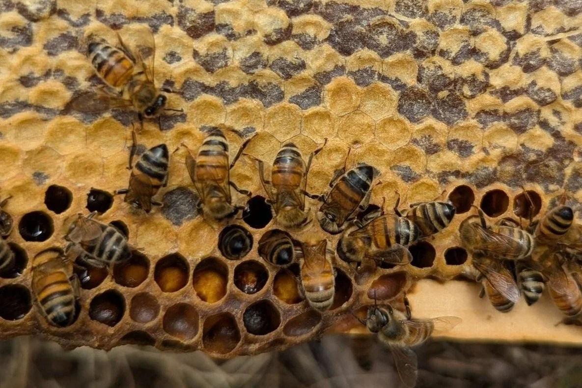 Pollen is the honey bees’ protein source, and it gets turned into “bee bread.” Honey bees collect pollen and store it in their pollen baskets on their hind legs. Upon returning to the hive, they mix the pollen granules with their saliva before placing it into cells. This process actually ferments and preserves the pollen, since honey bee saliva has bacteria and yeast naturally present. Honey bees rely on the same genus of yeast humans use to make foods such as sourdough bread and beer! Usually, bee bread is in the broods’ nest, where the queen is located and laying all her eggs. This is because pollen provides the biggest protein source for honey bees, which is needed during their early developmental and young adult stages of life.